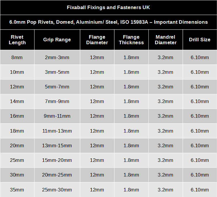 | Rivets pop de 6,0 mm, bombés, aluminium/acier, ISO 15983A – Dimensions importantes | |||||