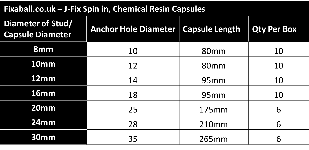 Fixaball vend toutes les tailles de capsules de résine chimique à marteau.