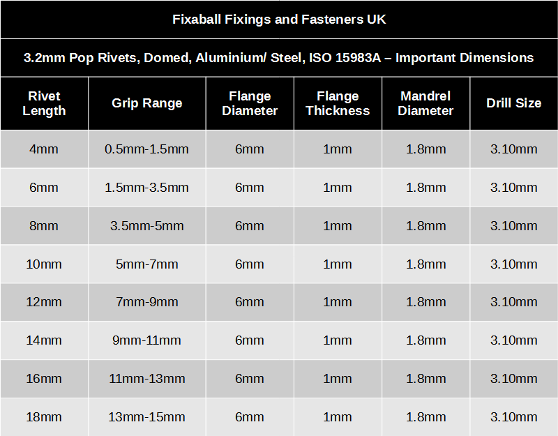 | 3.0mm Pop Rivets, Domed, Aluminium/ Steel, ISO 15983A – Important Dimensions | |||||