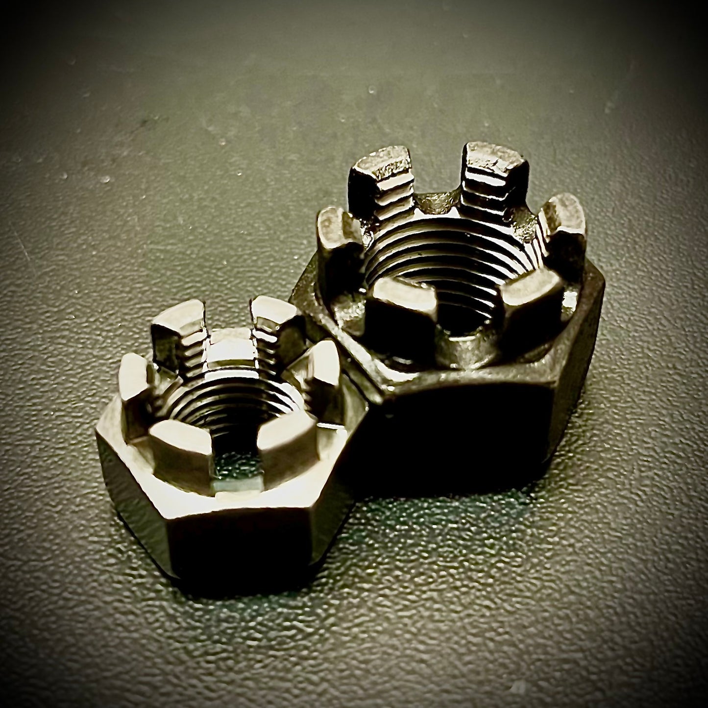 Castle/ Castellated nuts are hexagonal nuts with slots at the top that makes the nut resemble the battlements of a castle. These slots provide a substantial lock when used with a split pin. See below: