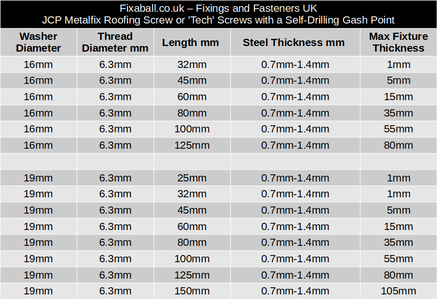Fixaball sells all lengths of tech roofing/ cladding screws.