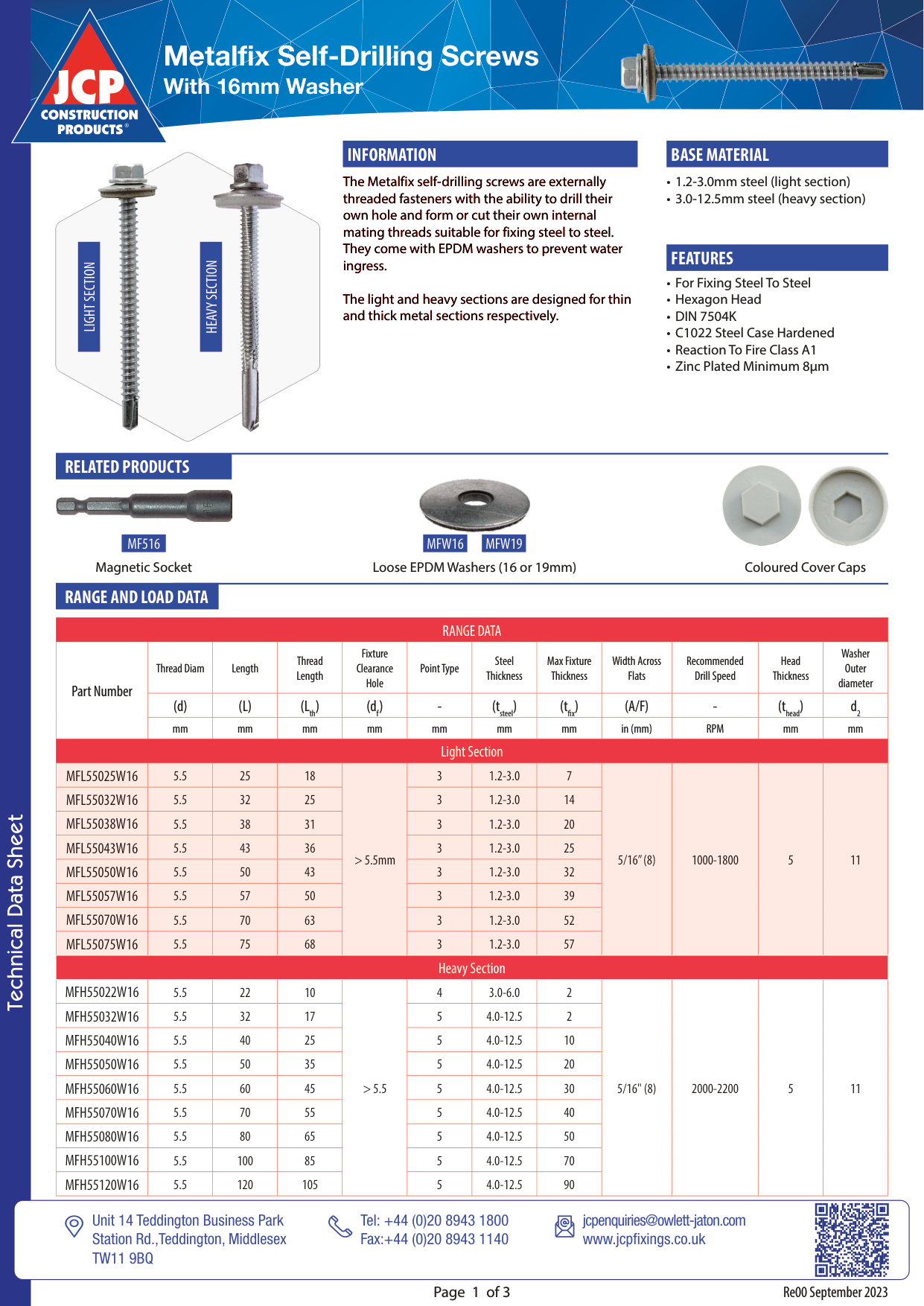 JCP Metalfix Self-Drilling Cladding/ Roofing Screws Heavy Section DIN 7504K 16mm EPDM Washer BZP