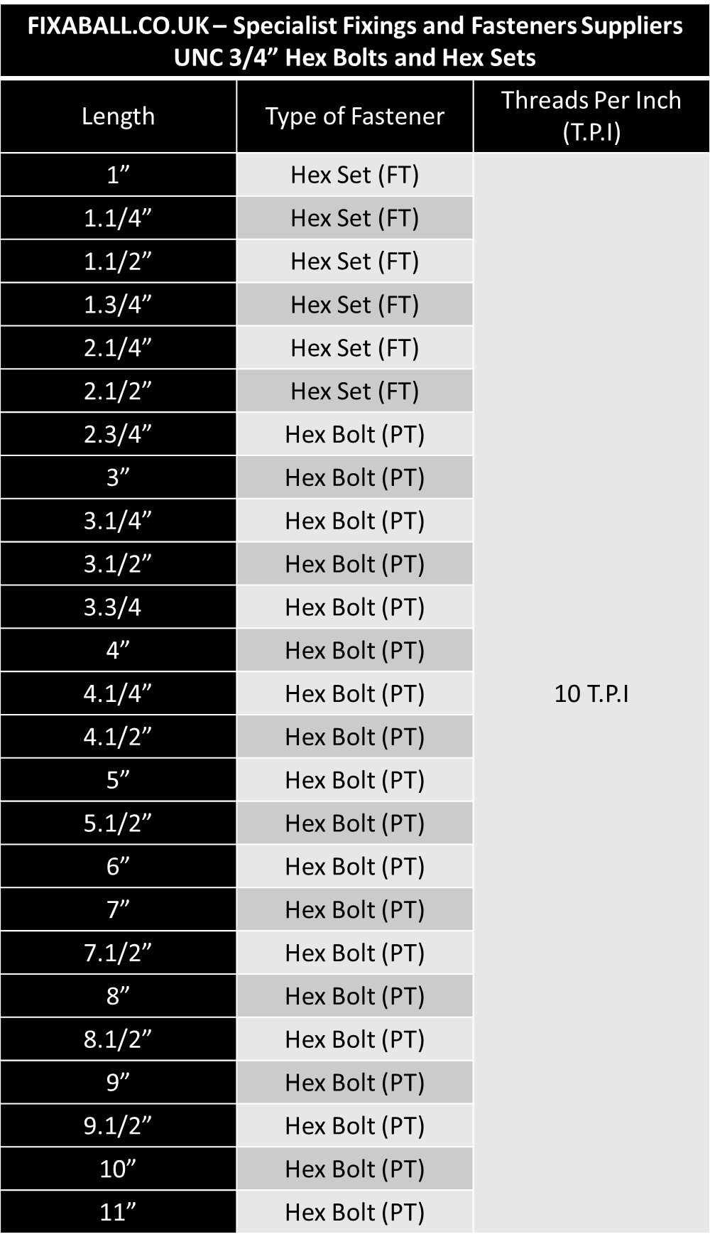 Fixabal sells all lengths of UNC 3/4" bolts (PT-Partially Threaded) and Sets (FT-Fully threaded).