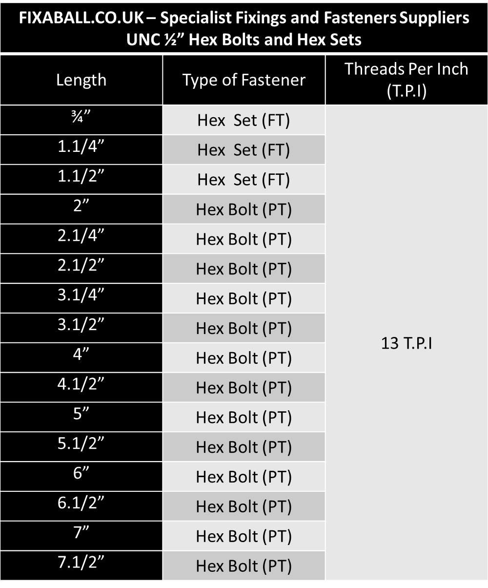 Fixaball sells all lengths of UNC 9/16", Hex Bolts and Hex Sets.