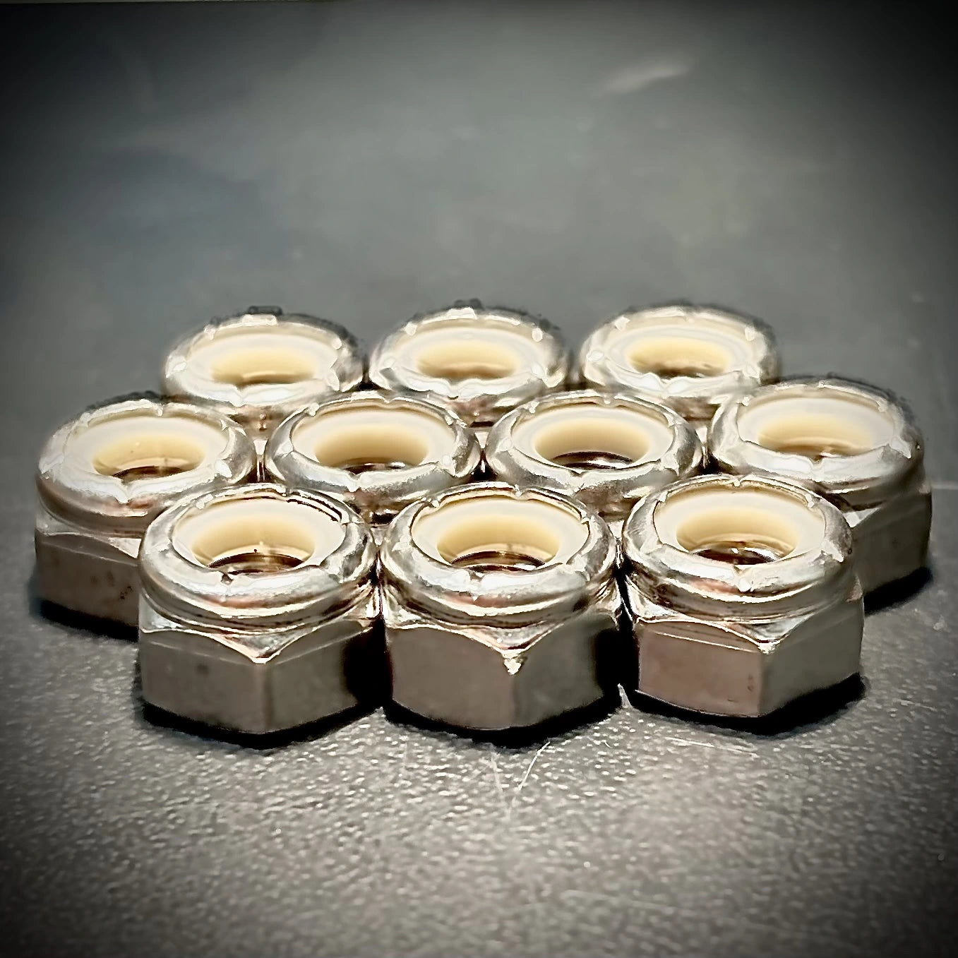 Fixaball sells diameters of UNC (Unified Course Thread), standard height (din 985 equivalent) nylon insert nuts, A2/ 304 Stainless Steel.