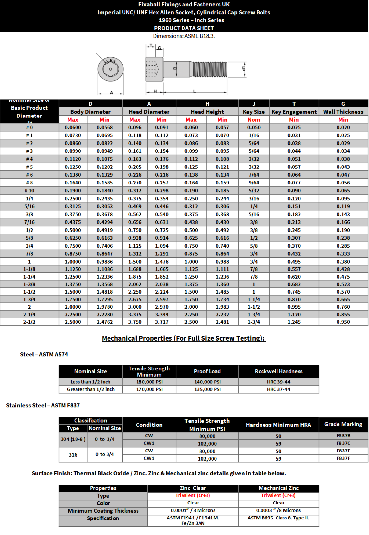 Fixaball – Specialist Fixings and Fasteners UNC/ UNF Socket Cap Screws Dimensions Conforming to ASME/ ANSI B18.3 1960 Series All measurements in Inches |